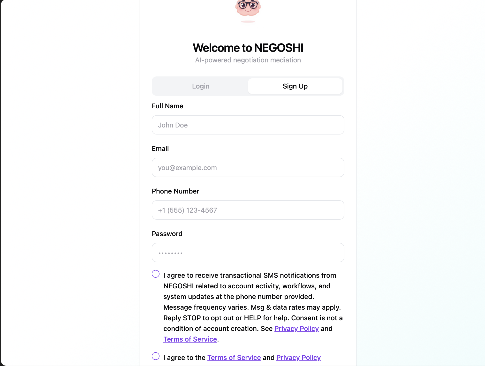 ☐ I agree to receive transactional SMS notifications from NEGOSHI related to account activity, workflows, and system updates at the phone number provided.